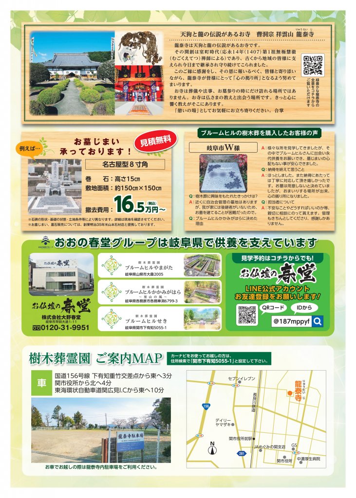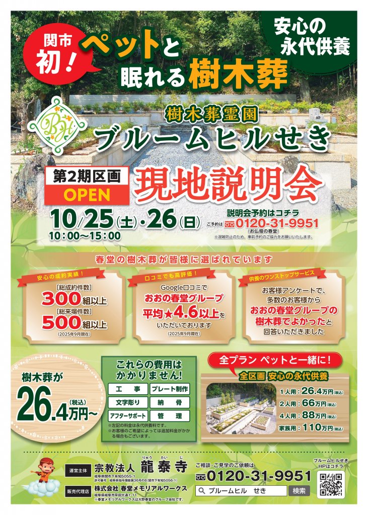 新着情報 樹木葬霊園 ブルームヒルせき 現地説明会を開催しますよ! 2025.10.18 【ブルームヒルせき 現地説明会】10月25日(土) 26日(日) ペットと眠れる樹木葬霊園 ブルームヒルせきにて現地説明会を開催いたします。永代供養付きのお墓をお探しの方やペットと一緒に眠りたい方。先々のために下見をしたい方、是非 ご来場下さいね!!♦ ブルームヒルせき(龍泰寺霊園内) 関市下有知5055-1♦ 10月25日(土) 26日(日) 10:00~15:00